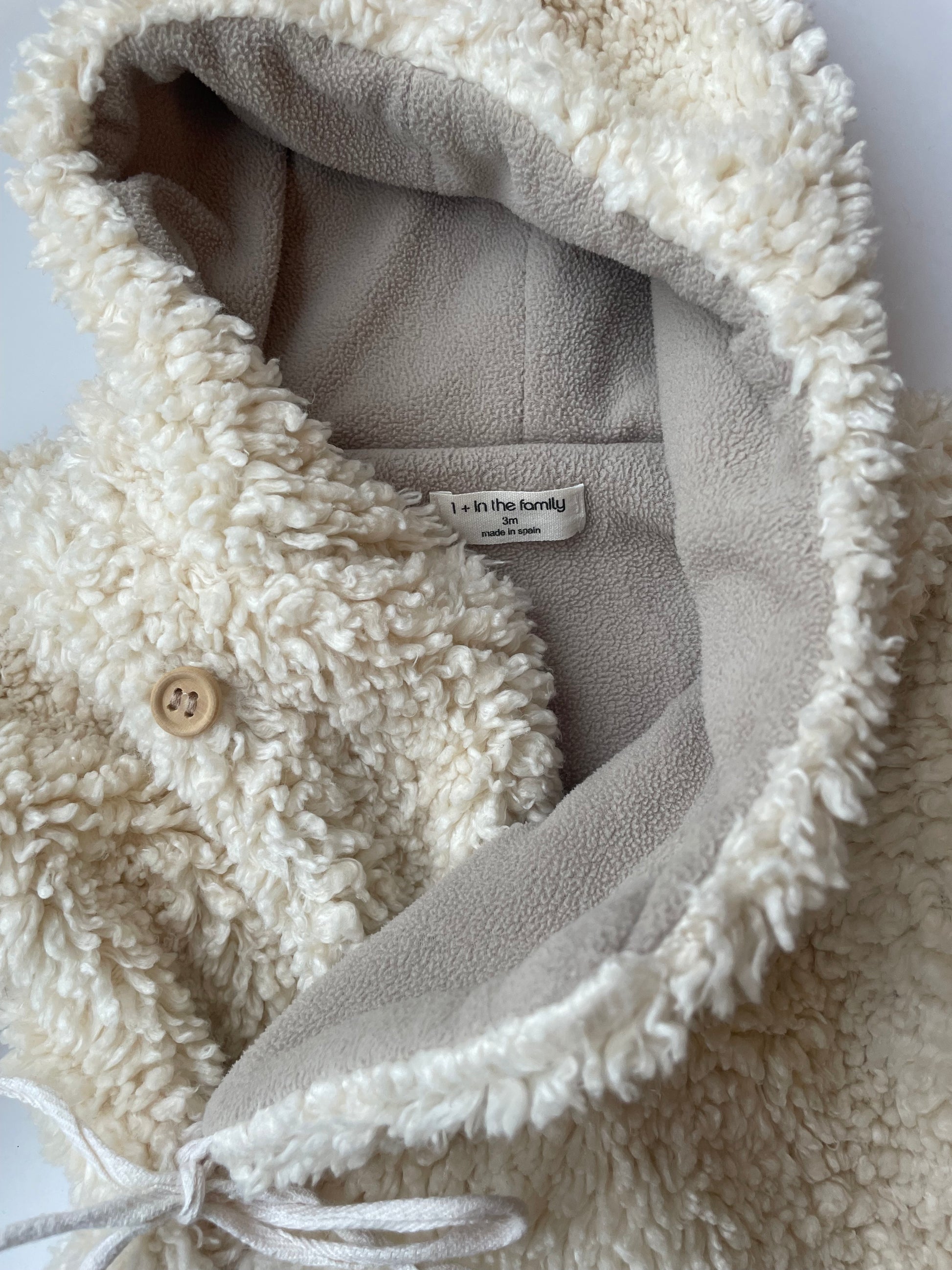 This teddy onesie by luxury brand 1 + in the Family is perfect for the winter months. Ultra-soft faux fur fabric provides exceptional warmth + comfort, perfect for cold weather snuggles. Built-in feet keep little toes toasty, whilst the ribbed cuffs keep warmth in. Snuggly hood adds extra protection from the cold. Easy tie and button closure make dressing simple. It's on perfect condition. I only had to replace the top button with a new wooden button.