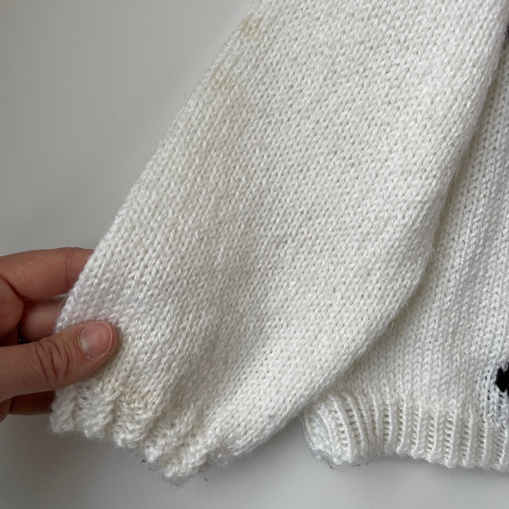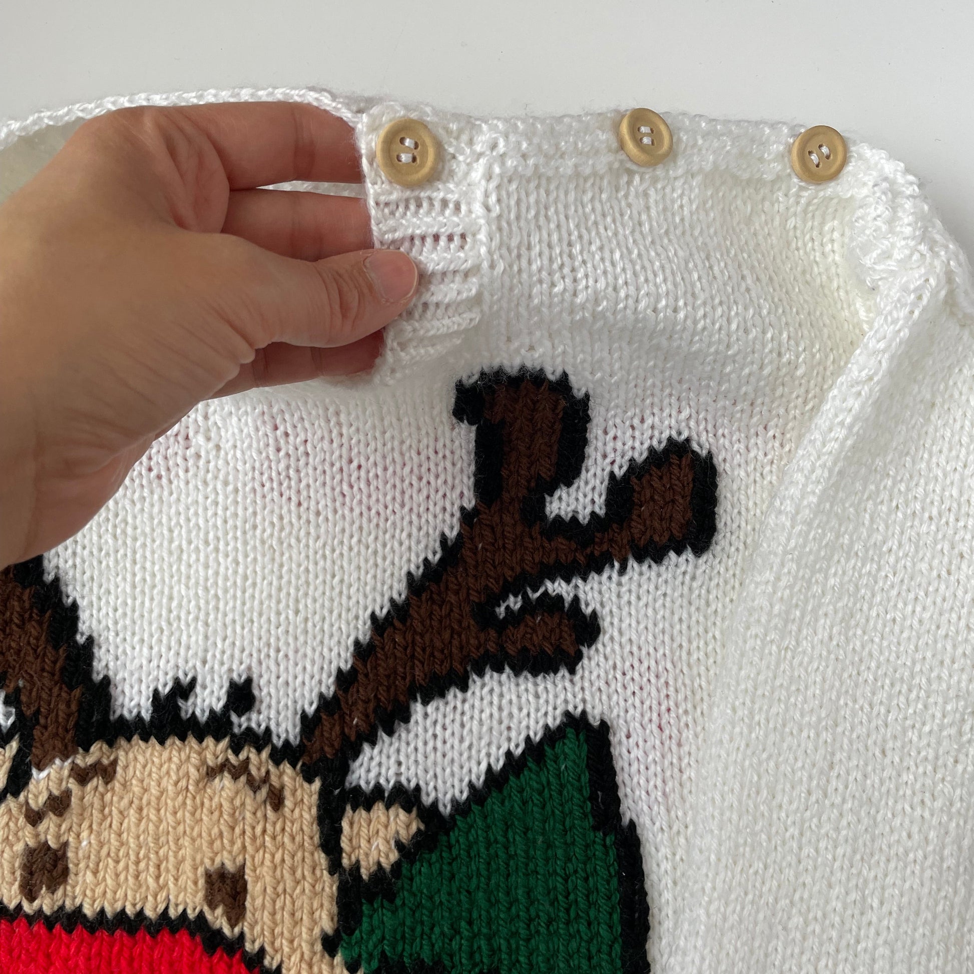This handmade Christmas sweater says Merry Christmas in Welsh "Nadolig Llawen" on the back and has the most adorable reindeer on the front. Three wooden buttons on the shoulder. Overall great condition only a couple of faded stains on the sleeve as shown in picture.