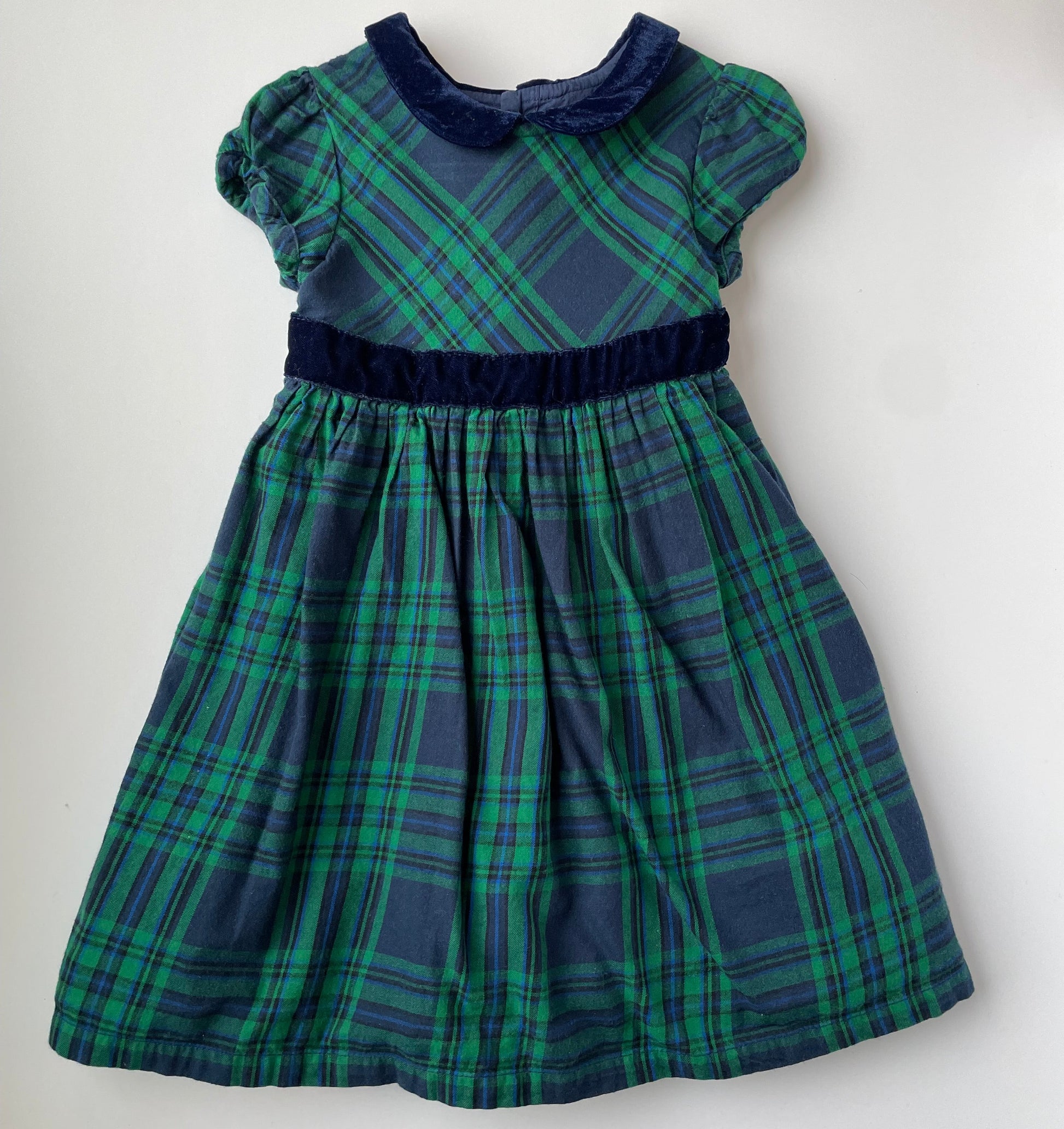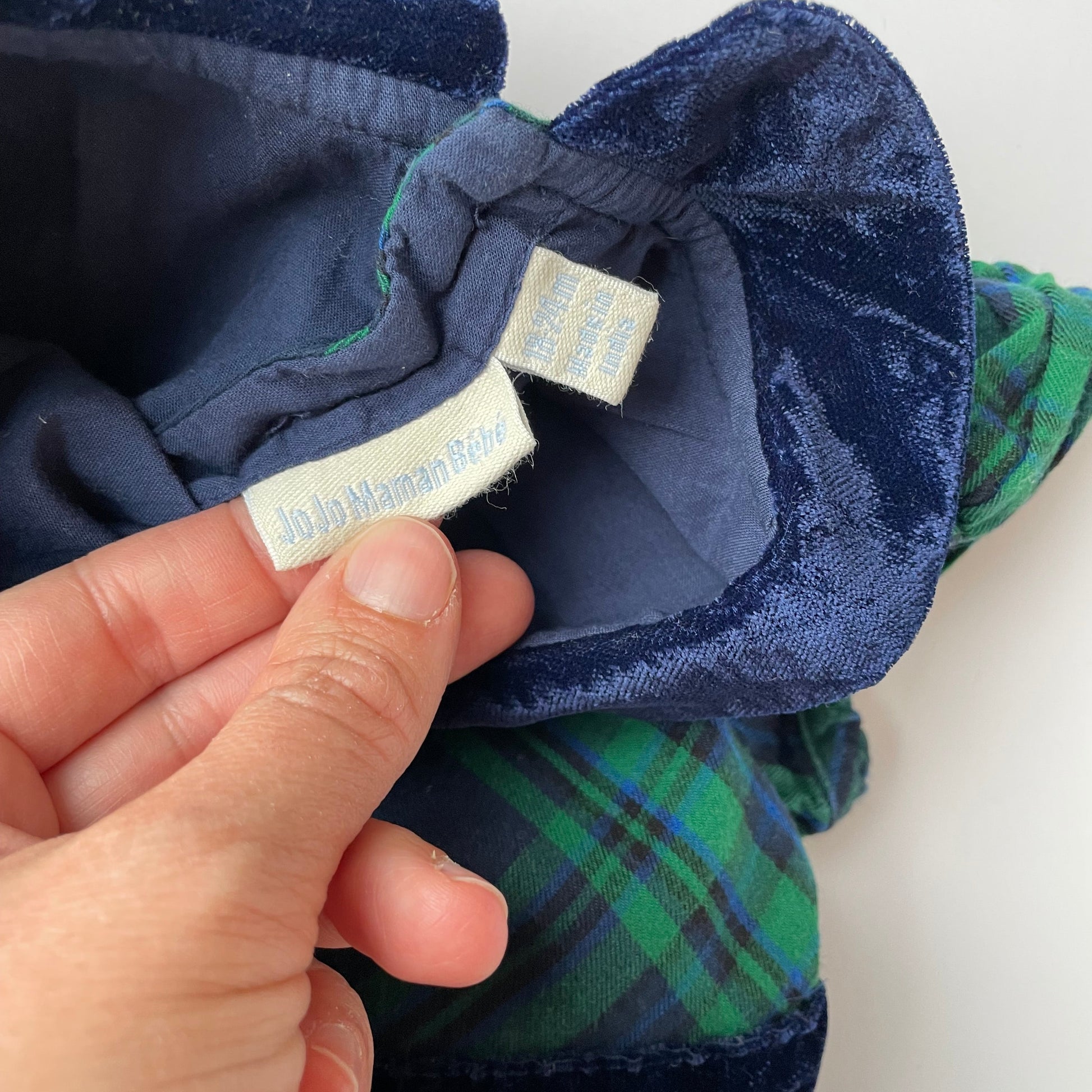 This festive checked dress by JoJo Maman Bébé is in great condition. It has a dark blue velvet collar and waistline with a tie ribbon a the back. The beautiful white petticoat makes it extra special. Perfect for Christmas!