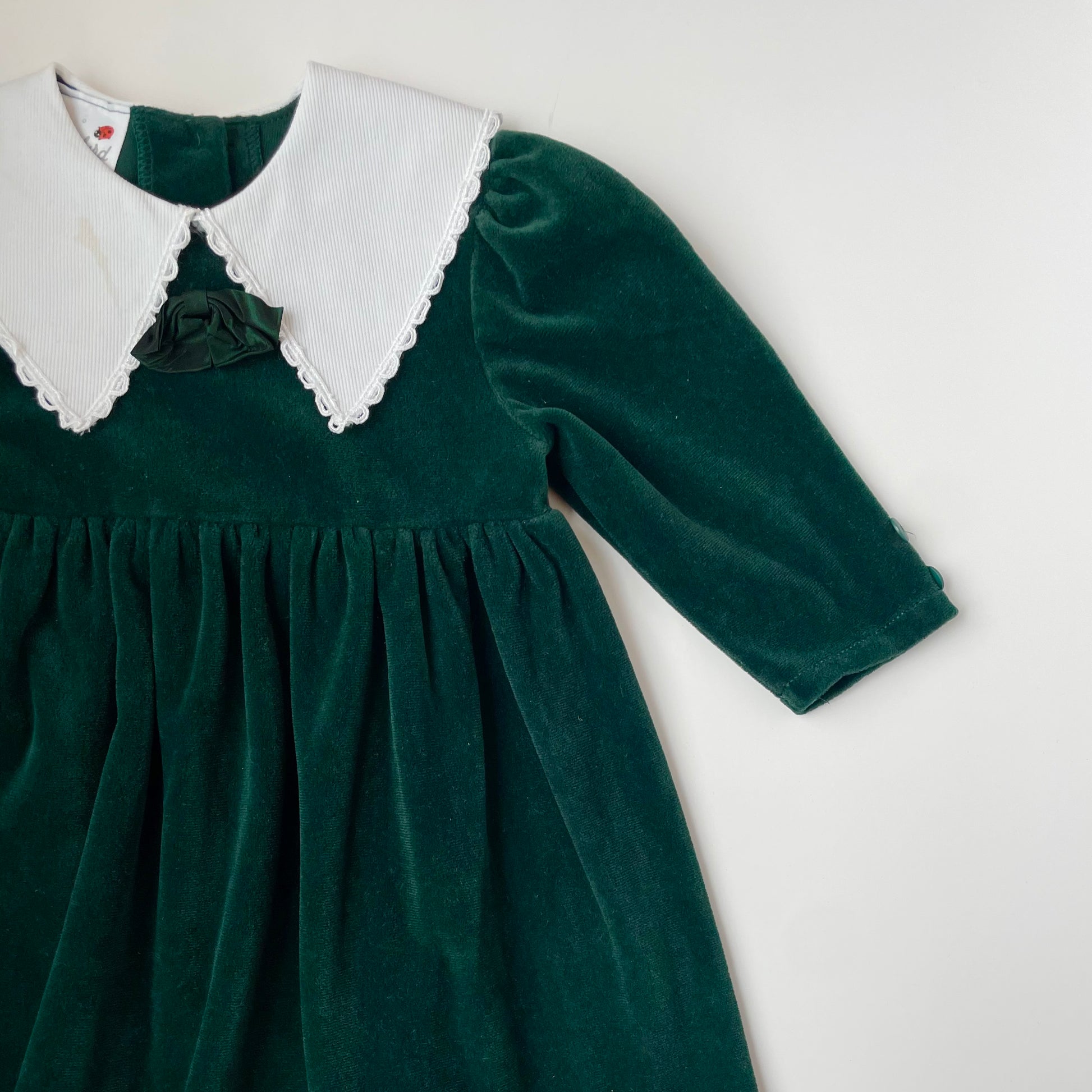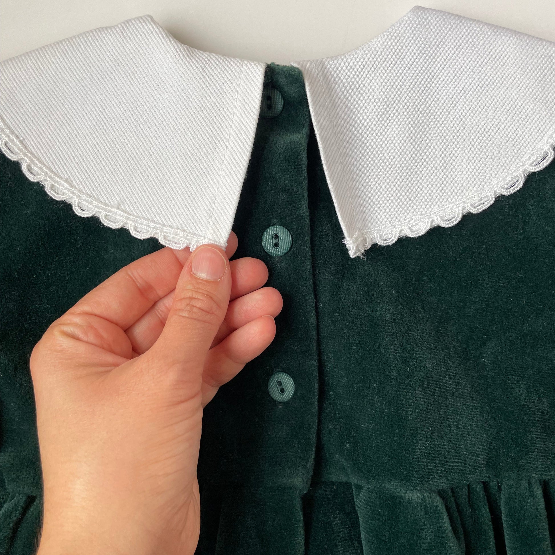 This dark green Vintage winter dress by Ladybird is made from high quality velvet and has a button closure at the back. It has a lovely white collar and a bow detail in the front. The dress is in great Vintage condition but has a faded stain on the collar as seen on picture 8.