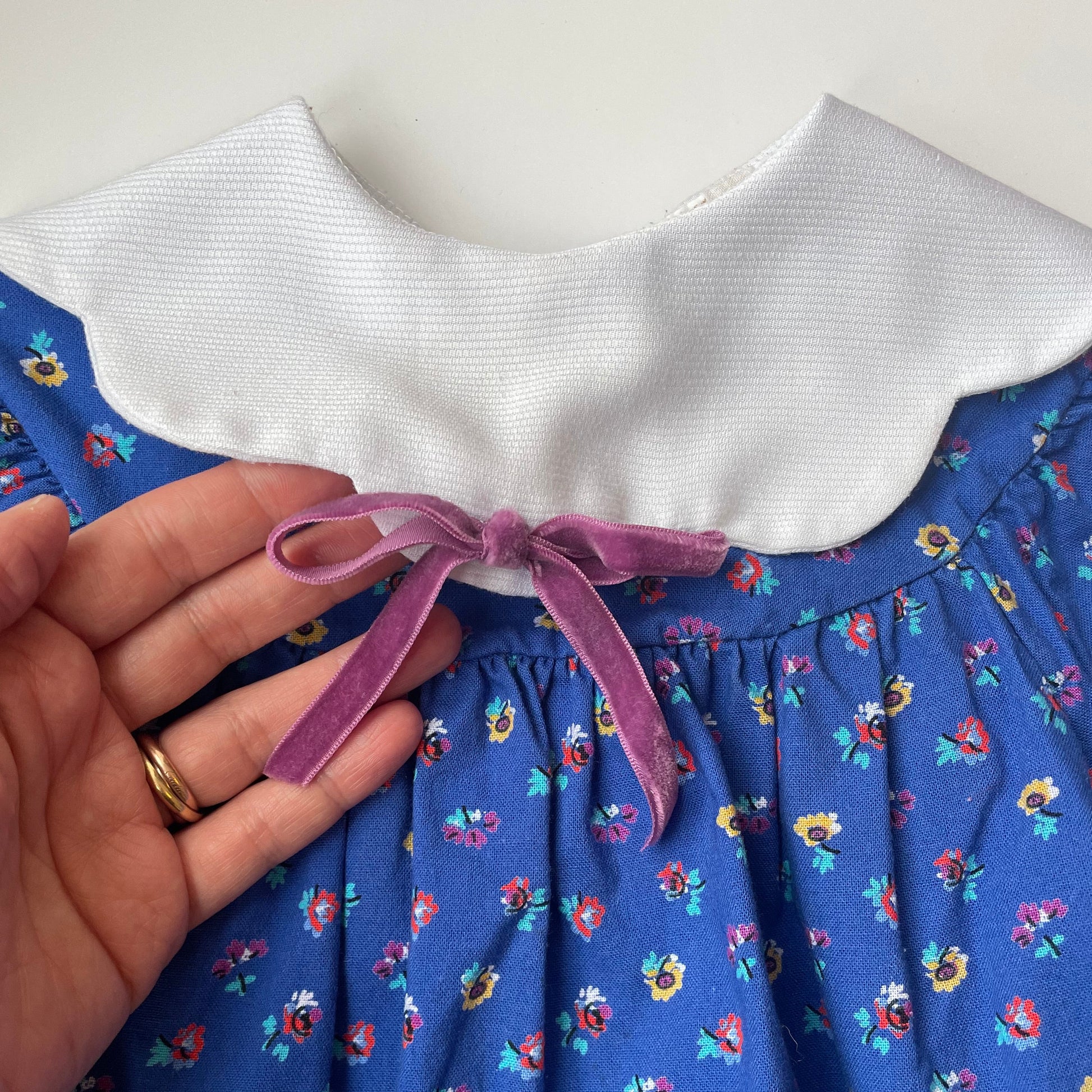 This blue true 1980s Vintage dress by Mary Arden is an absolute gem. It has a lovely white scallop collar with a velvet bow detail in the front and has a button closure at the back. The dress is in flawless condition. Made in England.