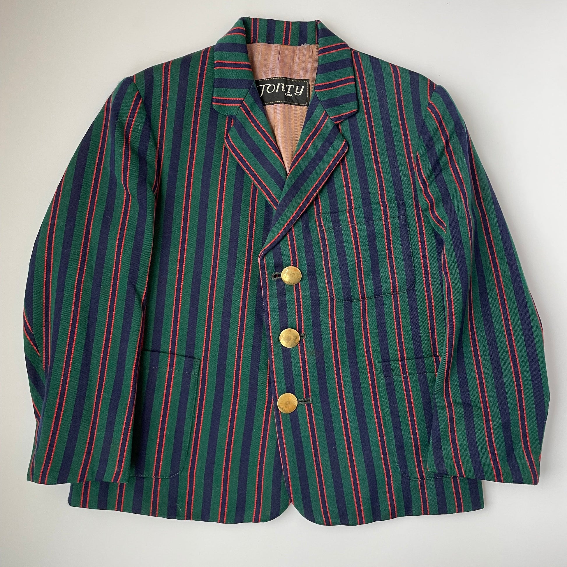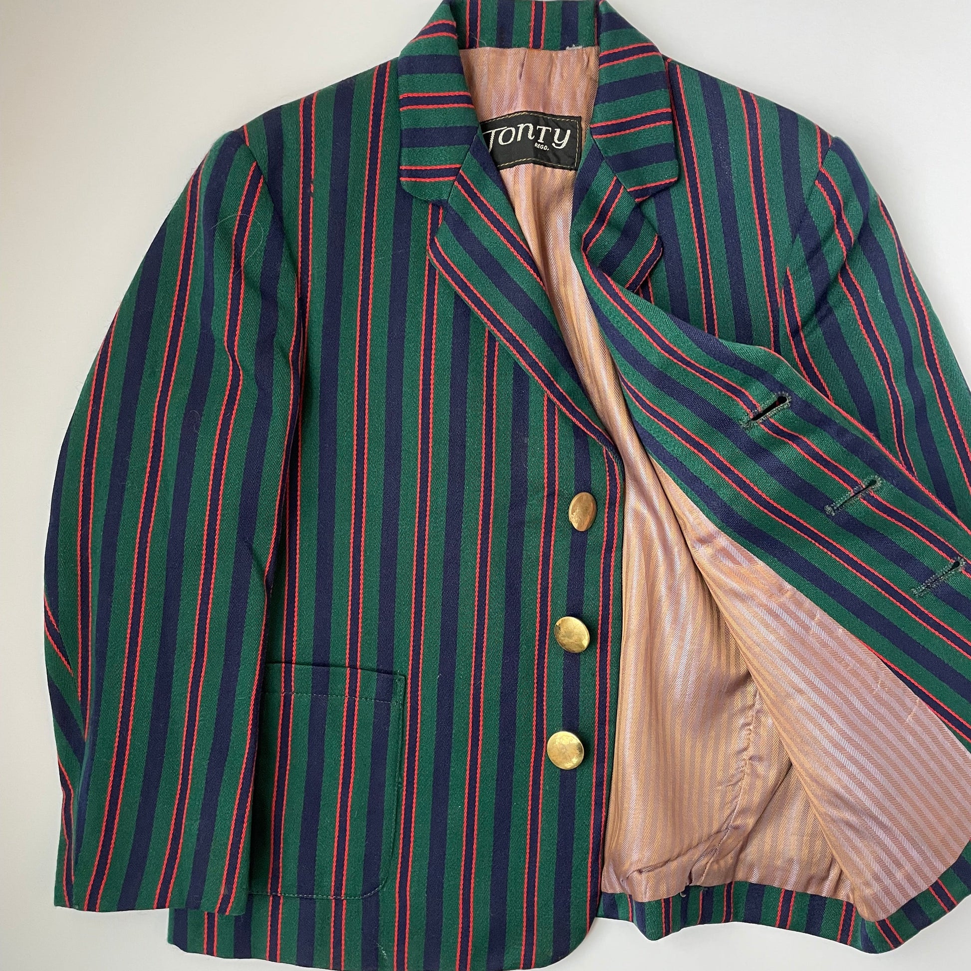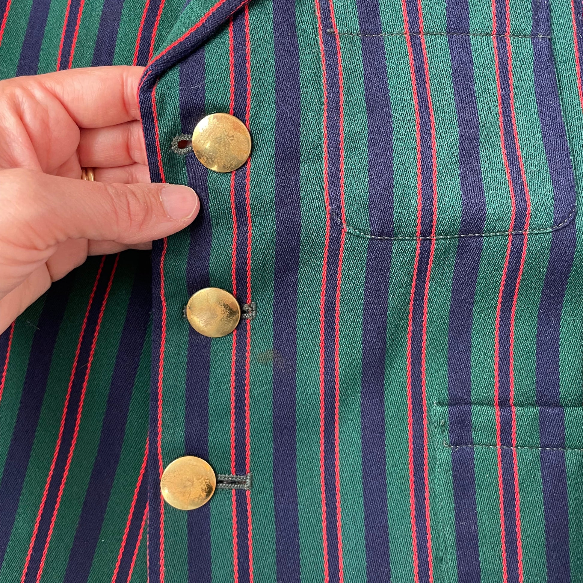 This festive blazer has a striped pattern and golden buttons. It's perfect for Christmas and can be combine with smart or casual trousers. The blazer is in great condition. The buttons show slights signs of wear but nothing major.